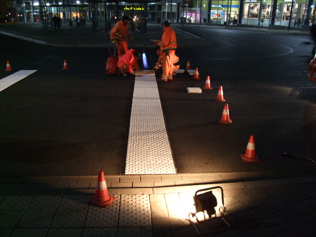 Mit dem Bereich taktile Bodenmarkierungen setzt die heinz jasper GmbH auch Maßstäbe für barrierefreie Markierungen im öffentlichen Raum. Mit einem spezielle entwickelten Verfahren für Applikationen werden diese taktilen Markierungen nach DIN DIN 32984 (Bodenindikatoren im öffentlichen Raum) von uns angebracht.